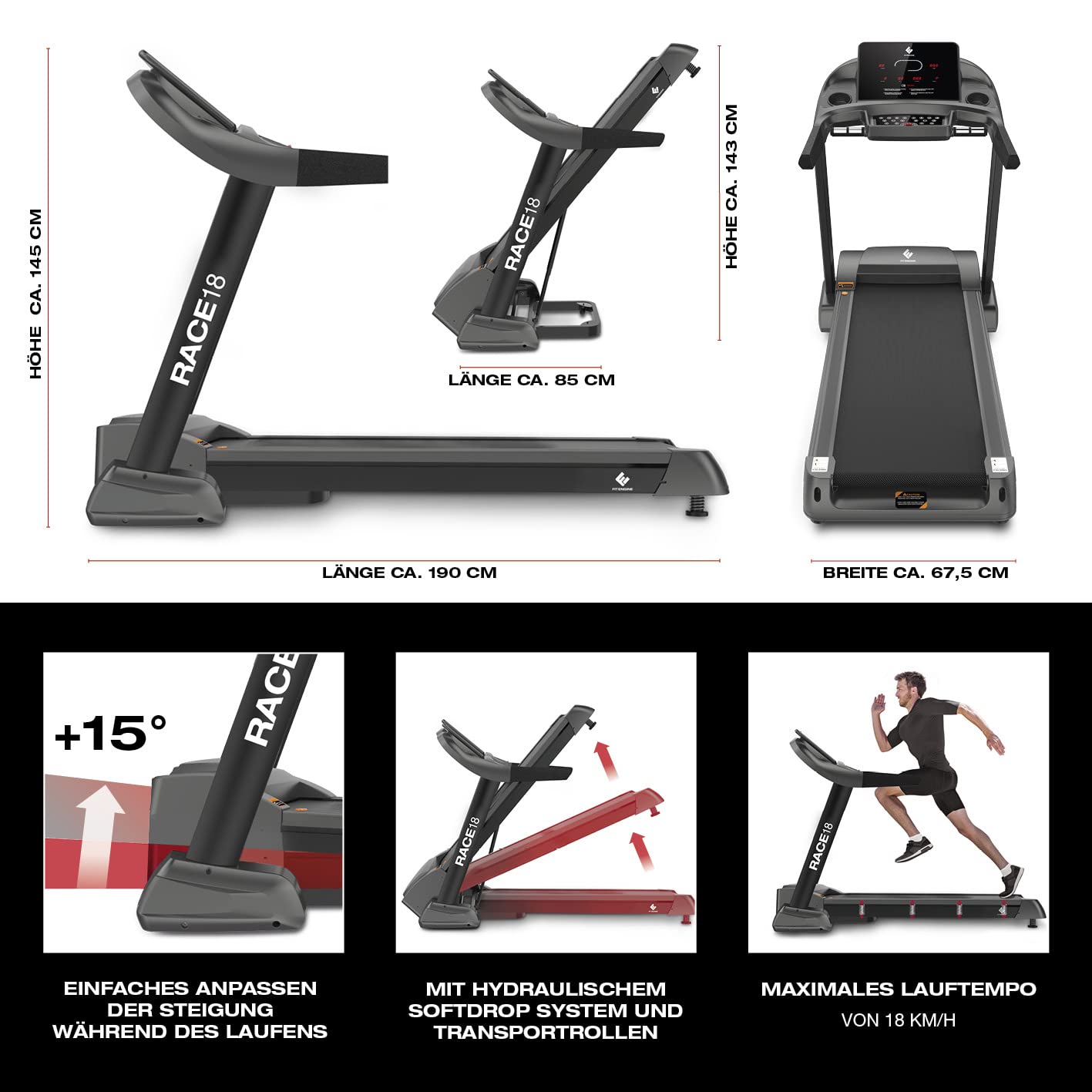 FitEngine Laufband RACE18 | Klappbares Laufband mit extra leiser 8-Zonen-Dämpfung | bis zu 150 kg Traglast | 15% automatische Steigung | 7 PS bis zu 18 km/h | Großes Display, Lautsprecher & Bluetooth